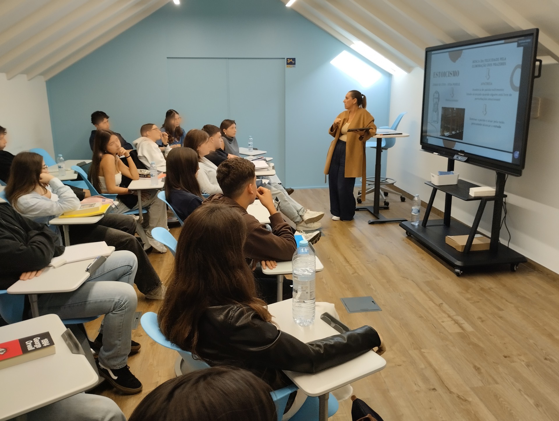 Onde está a felicidade? Esta é uma das questões que epicuristas e estoicos procuraram responder, na Antiguidade clássica, e que, no dia 7 de novembro, estiveram no centro das atenções da palestra conduzida pela Dr.ª Vera Rodrigues aos alunos do 12.º ano. Esta iniciativa permitiu uma melhor compreensão do epicurismo e do estoicismo e da importância destas correntes filosóficas na obra de Ricardo Reis.
