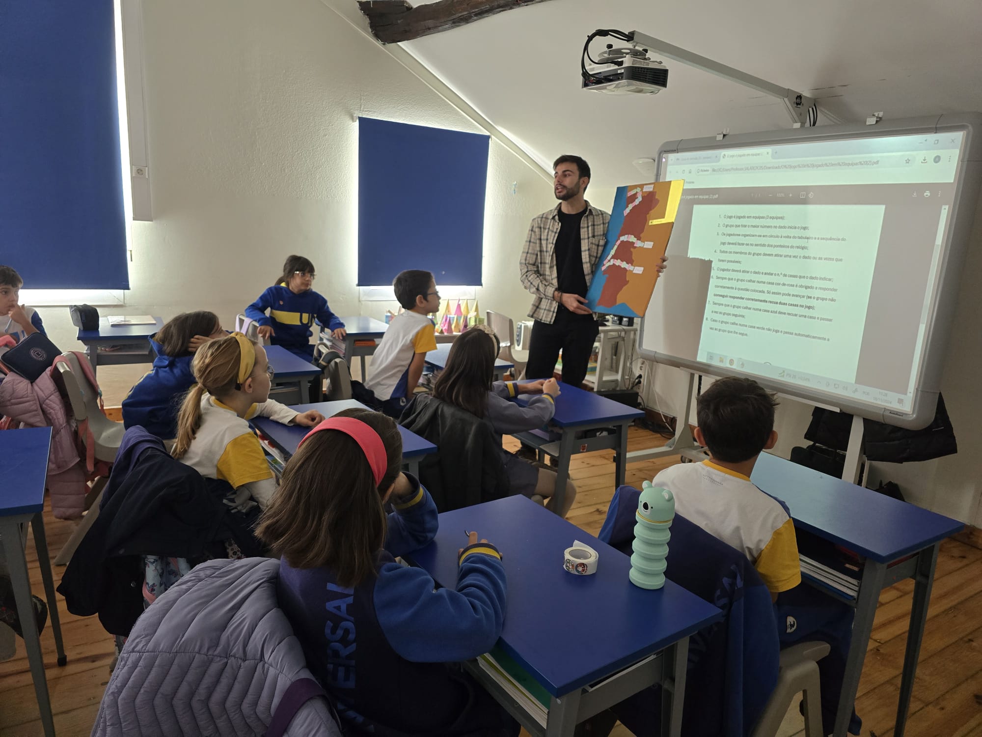 No âmbito das aulas de estudo do meio e do projeto Ensinar Integrando, os alunos do 4.º ano contaram com uma divertida e enriquecedora atividade dinamizada pelos professores Alexandre Pereira e Joana Alves, sobre as Invasões Francesas. A aula não poderia ter terminado da melhor maneira senão com um jogo de tabuleiro que cativou todos os alunos. Assim, através da cooperação entre docentes, promoveu-se o crescimento mútuo e construiu-se aprendizagens mais ricas e significativas para as nossas crianças.