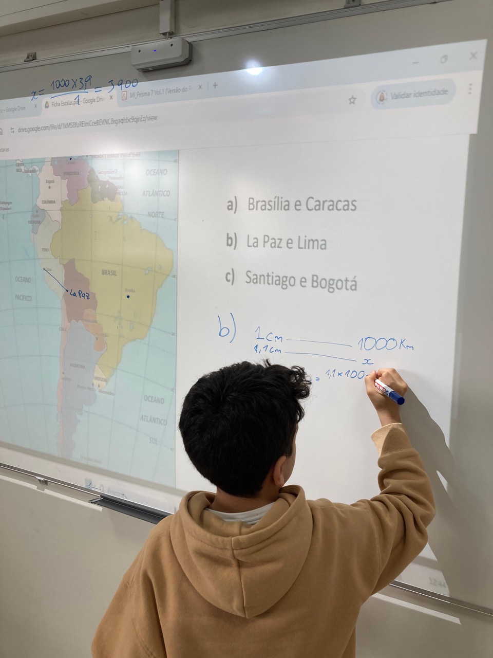 Os alunos do 7.º ano estudaram as escalas através da interação das disciplinas de Geografia e Matemática! O foco da atividade foi o cálculo de distâncias reais a partir das escalas de um mapa.
