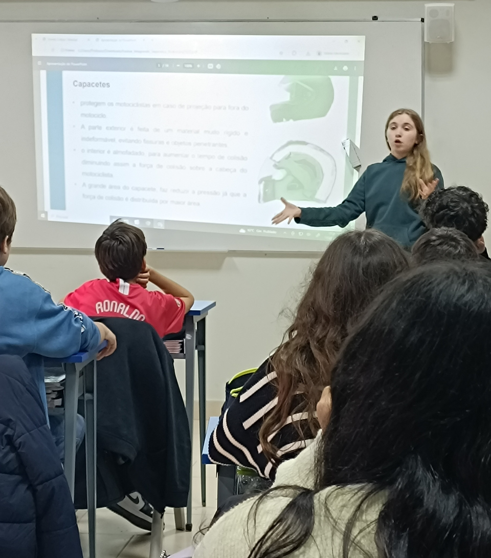 No dia 17 de fevereiro, os alunos do 9.º ano integraram conceitos da disciplina de Físico-Química na área de Cidadania e Desenvolvimento do 8.º ano. Esta inusitada junção resultou numa interessante sessão sobre Segurança Rodoviária. A reflexão conjunta abordou a importância do air bag e do cinto de segurança e destacou, ainda, o uso do telemóvel e a fadiga como grandes causadores de acidentes na estrada.