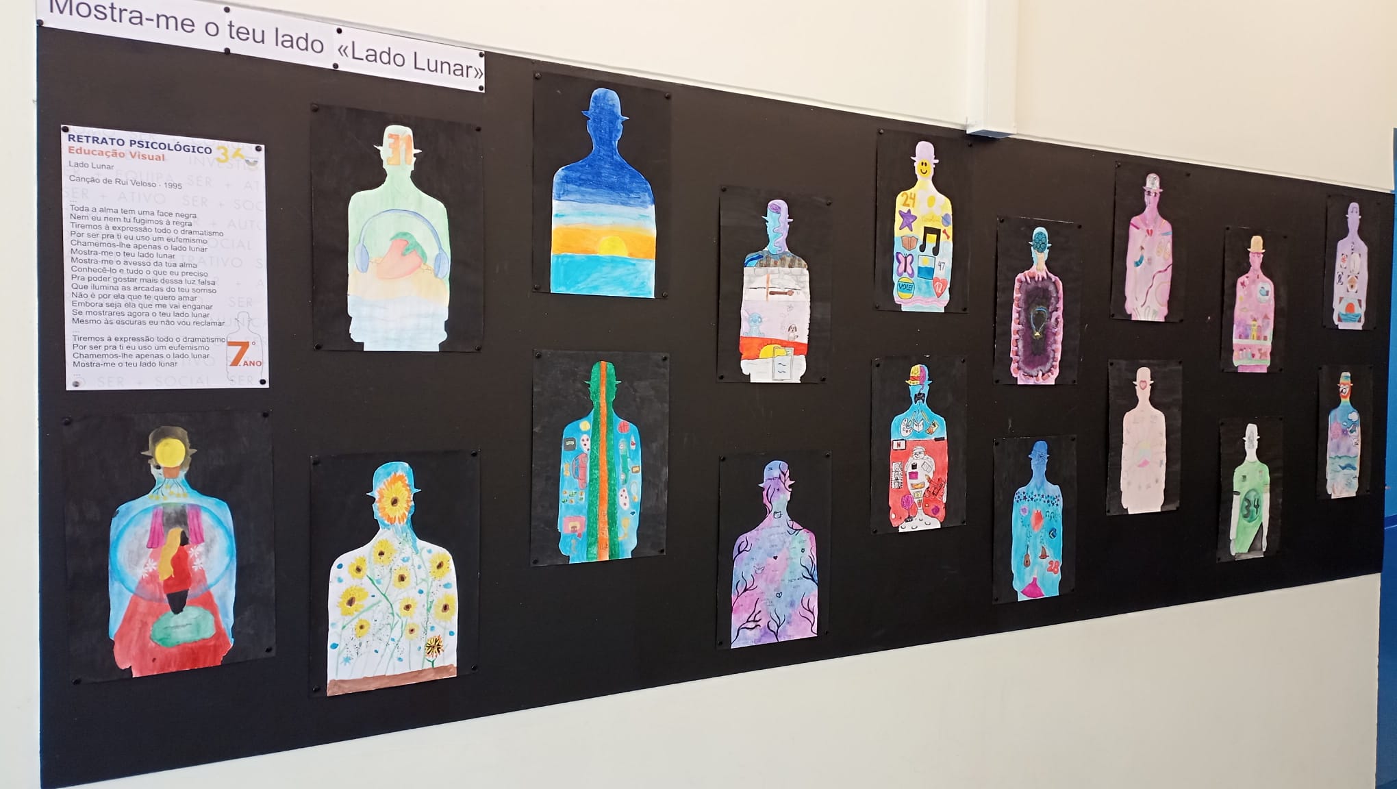 A proposta de trabalho apresentada aos alunos do 7.º ano era ir além do que os olhos conseguiam ver e criar uma composição plástica que revelasse as profundezas da sua personalidade.