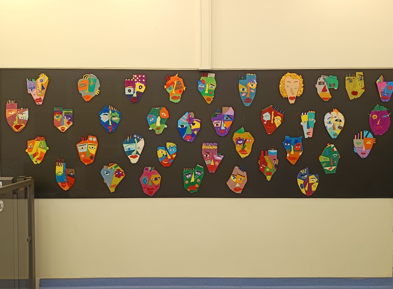 Durante o 2.º período, os alunos exploraram expressões faciais e formas do rosto humano, criando composições inspiradas no Cubismo e na Pop Art. No final, produziram obras com técnicas de pintura e colagem, cheias de cor e criatividade.