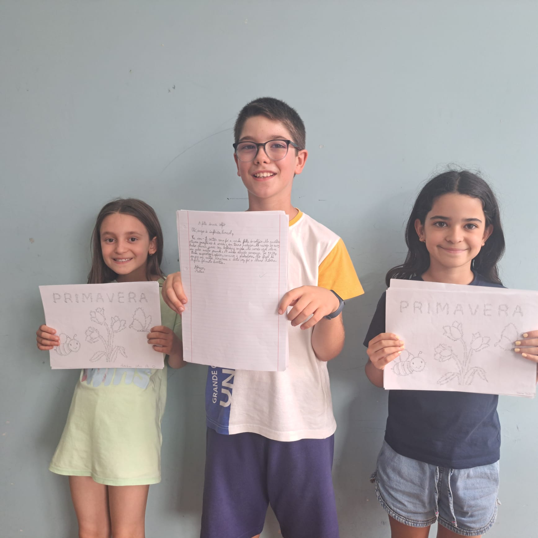 Os alunos do 3.º e 4.º anos criaram textos variados semana após semana. As folhas de papel transformaram-se em jardins coloridos, cheios de borboletas, flores e ideias doces. As palavras dançaram no papel em diversas formas criativas: poesias visuais sobre a primavera, receitas da amizade, cartas aos amigos distantes imaginando vidas diferentes, textos sobre frases divertidas como: “Uma escola onde os livros contam histórias em voz alta”, “Um tubarão que adora tocar violino” ou “Uma princesa que anda de trotinete nas nuvens.