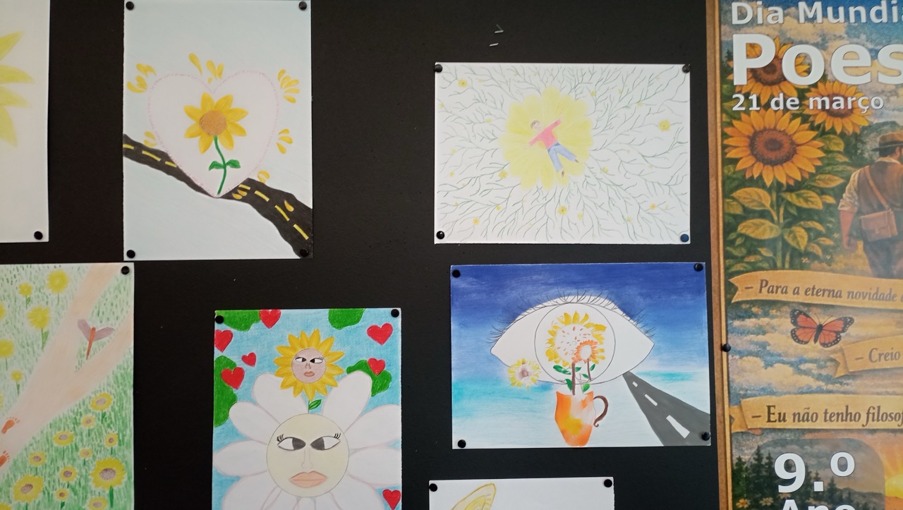 Os alunos do 9.º ano participaram num projeto interdisciplinar de Português e Educação Visual, inspirado num poema de Alberto Caeiro, para assinalar o Dia Mundial da Poesia. A iniciativa resultou em ilustrações originais que traduzem a poesia em linguagem visual, promovendo a criatividade e o desenvolvimento artístico dos alunos.